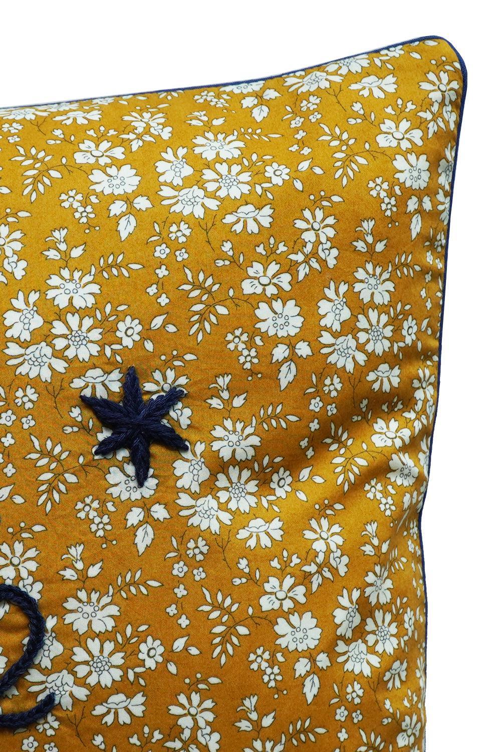 Coco & Wolf x Polly Wren Studios Embroidered Piped Edge Cushion made with Liberty Fabric CAPEL MUSTARD