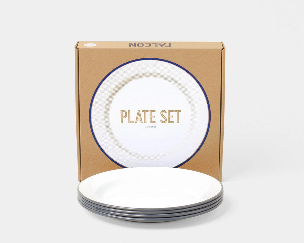 Four enamel plates with coloured rims. Perfect for dinner parties or camping trips.