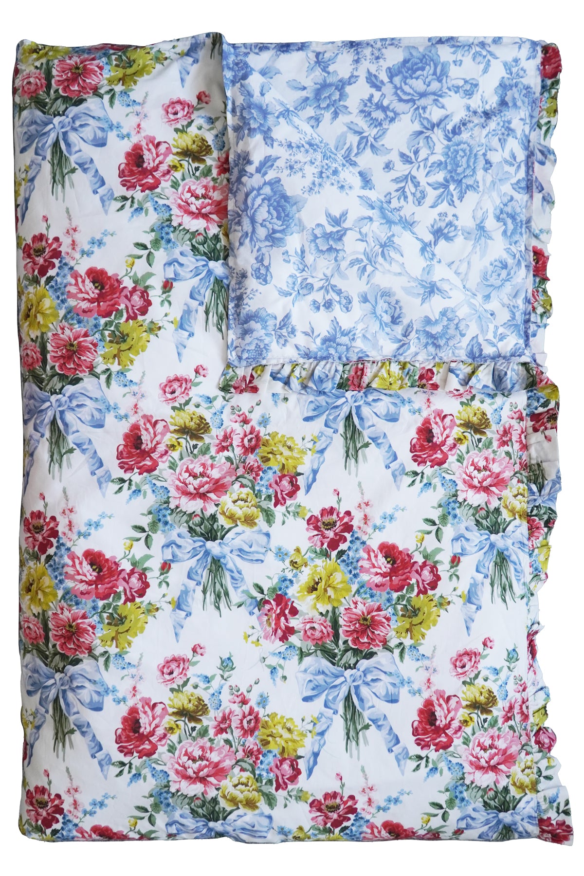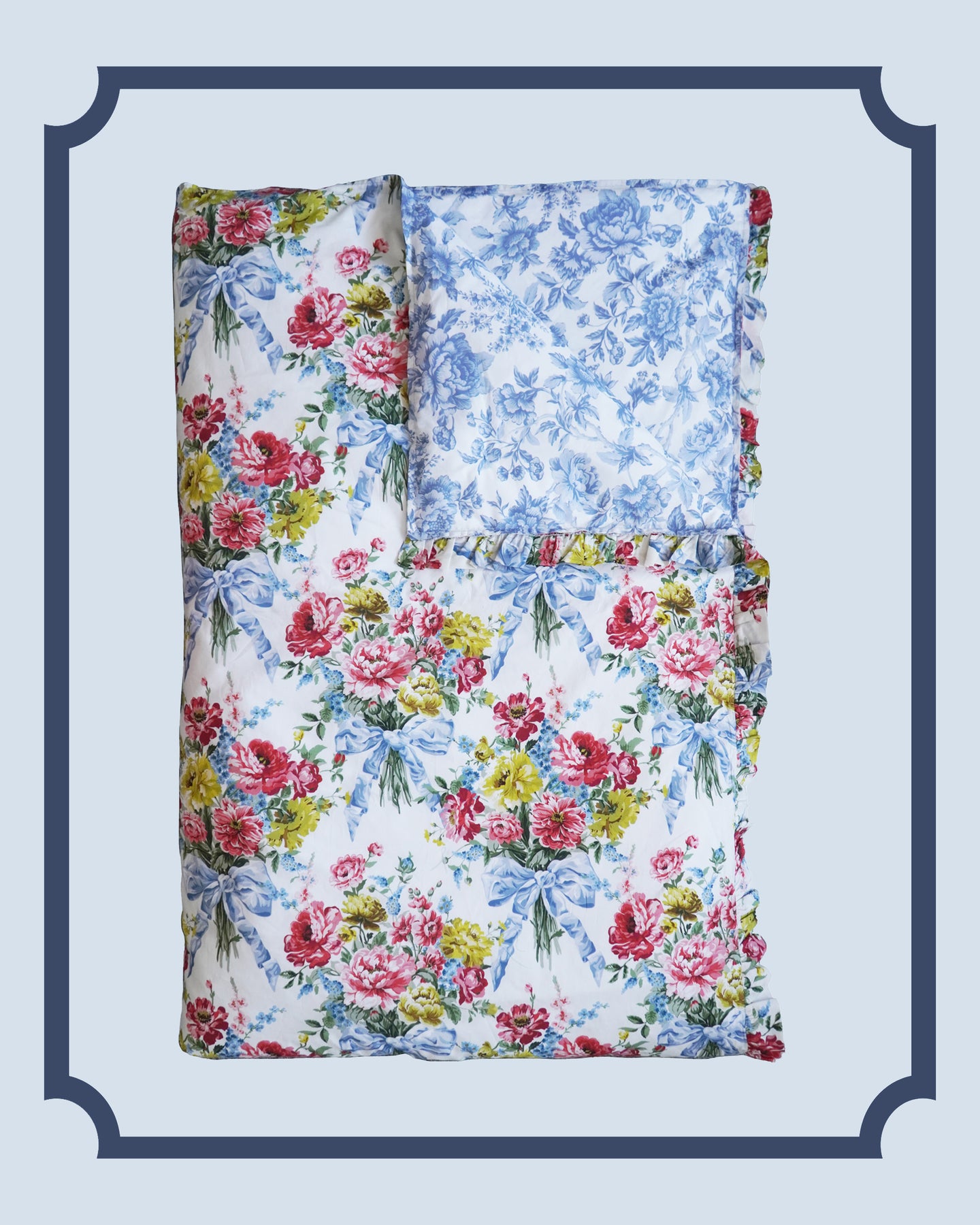 Bridgerton Reversible Ruffle-Edge Heirloom Quilt made with Liberty Fabric BOW BOUQUET BLUE & REGENCY TRAIL CHINA BLUE